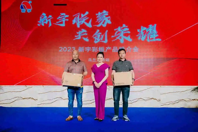 會場外,擺放有序的新宇、天宇產(chǎn)品樣板受到嘉賓的青睞,大家紛紛向工作人員咨詢產(chǎn)品細(xì)節(jié),尤其作為國家制造業(yè)單項冠軍產(chǎn)品的功能性彩涂板,豐富的產(chǎn)品選擇,過硬的產(chǎn)品質(zhì)量使得嘉賓連連稱贊。